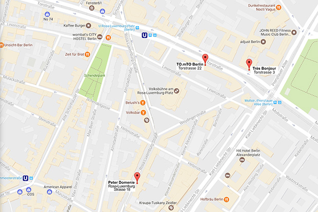 KINKY CORNER: Map shows locations of TO.mTO, Très Bonjour and Peter Domenie shops in Mitte
