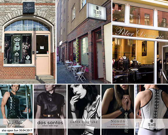 KINKY SHOPPING: Close-neighbour stores (l-r) Très Bonjour, TO.mTO and Peter Domenie host Kinky Shopping Weekend with guest labels Dos Santos (at Très Bonjour) and Nonón de Florette (at TO.mTO) during the Berlin 2017 weekend. Peter Domenie is also at the German Fetish Fair