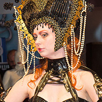 Those elements included a neck corset connected to single shoulder piece and chain leash, chest-flattening corset, ruffled hoop skirt with suspenders and attached latex stockings… and of course lots of Santala’s trademark hand-dyed detailing.