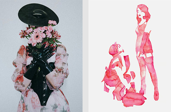 FORGET ME NOT imagery by Calmfors includes self-portraits with flowers, latex fetishwear and sometimes non-fetish garments, and watercolours depicting femdom scenarios, toys and more